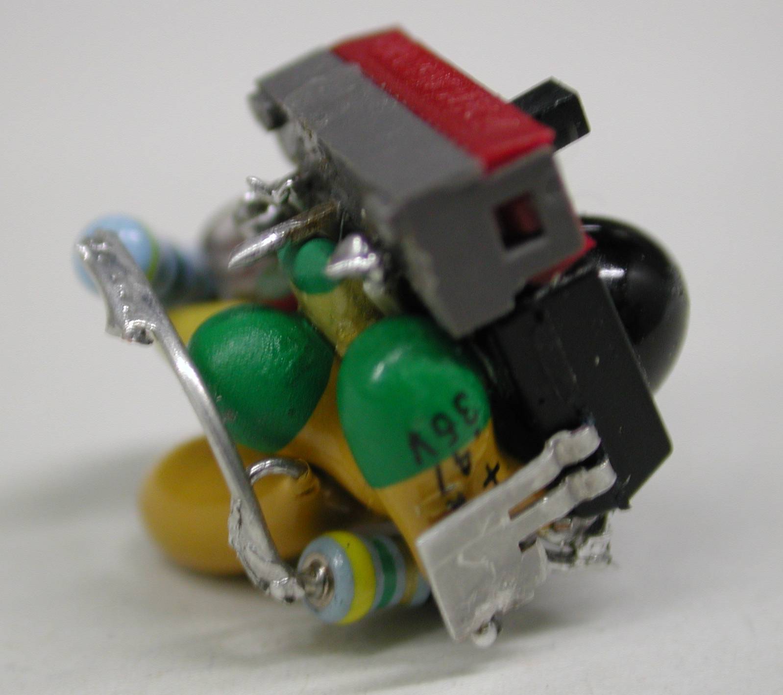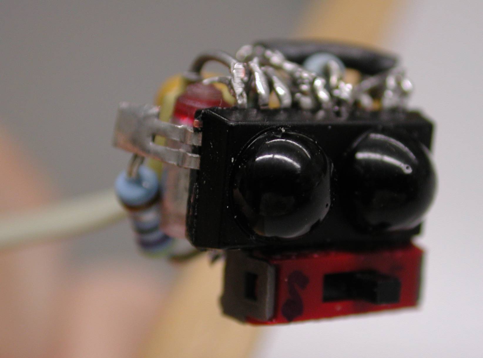 Here's the finished product. With the red swich one can swich between the SIR and the faster but at the time not yet so well supported FIR standard. BTW the first time I attached it to my computer one capacitor went up in smoke. Damn the malodour lasted longtime! It was a special capatitor with a polarity. Now I know, and the IrDa is working well.