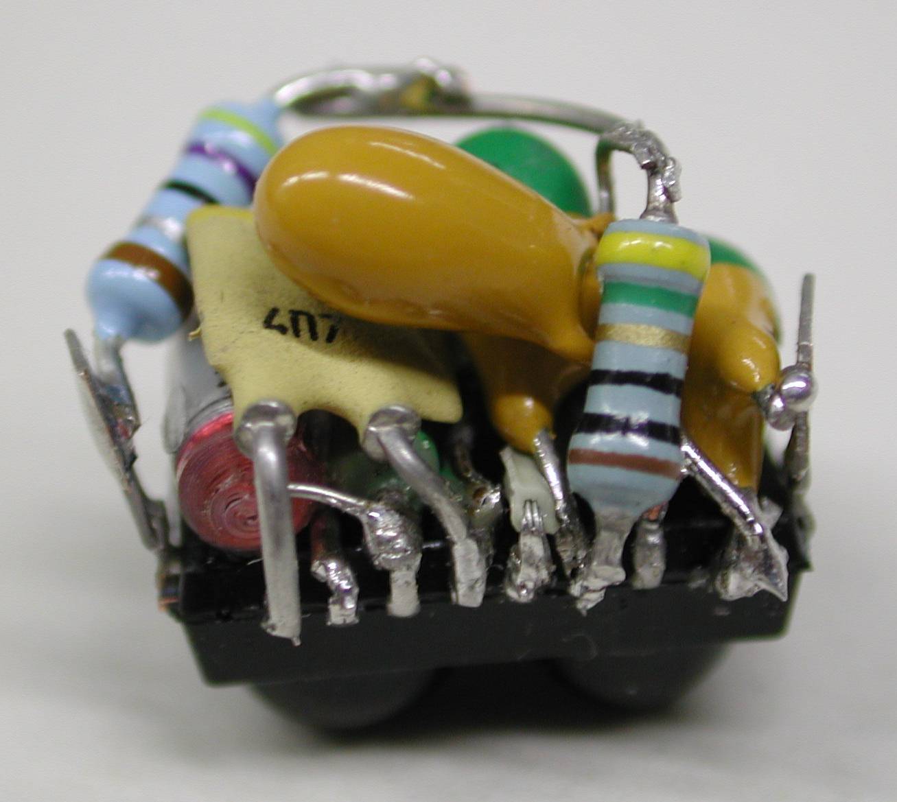 IrDa transcievers (infrared light transmitter and recievers) are used for wireless comunications for example between cell phones and computers. Normally PCs are bought without without any IrDa transciever; you can buy them as accessories, but they are bulky and expensive. These devices you typically want to occupy no space, but still 'see' your desktop, since sight contact is required for the transmission of data through IrDa. Beyond the tranciever chip with the light emitting diode and the receiving photodiode (an Agilent HDSL 1100, packaged in black plastic with two half sphere IR lenses) only common resistors and capacitors are used, mainly for protecting the chip and signal from voltage spikes. I decided to build one myself, for improving my soldering skills, and get an IrDa as tiny as possible. I implemented the reference scheme from the manual of th IrDa chip (local copies 1, 2).